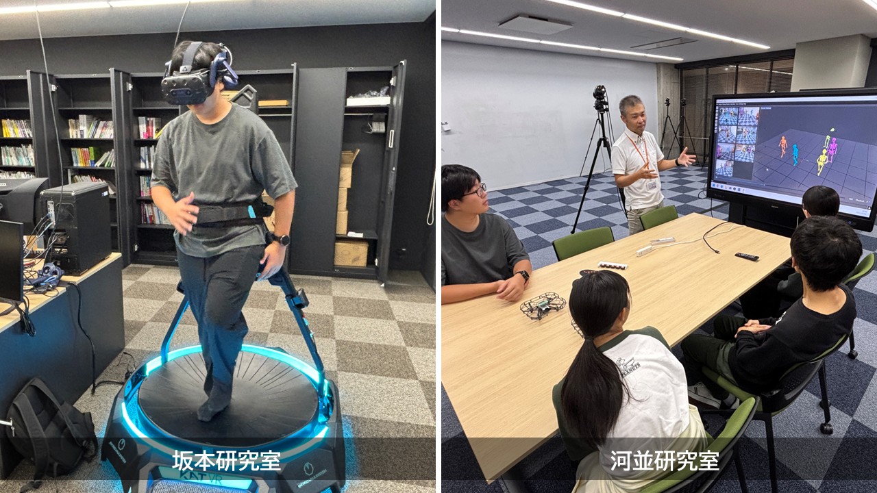 最後に、2つの研究室を案内していただきました。坂本研究室では仮想空間に自分の動きを投影する歩行型VRデバイスを体験し、身体とデジタルの融合技術に驚かされ、河並研究室では、高精度カメラによるモーションキャプチャ技術のデモを体験、高齢者の見守りなどへの応用事例も紹介いただき、ITが社会に貢献する可能性について深く学ぶことができました。