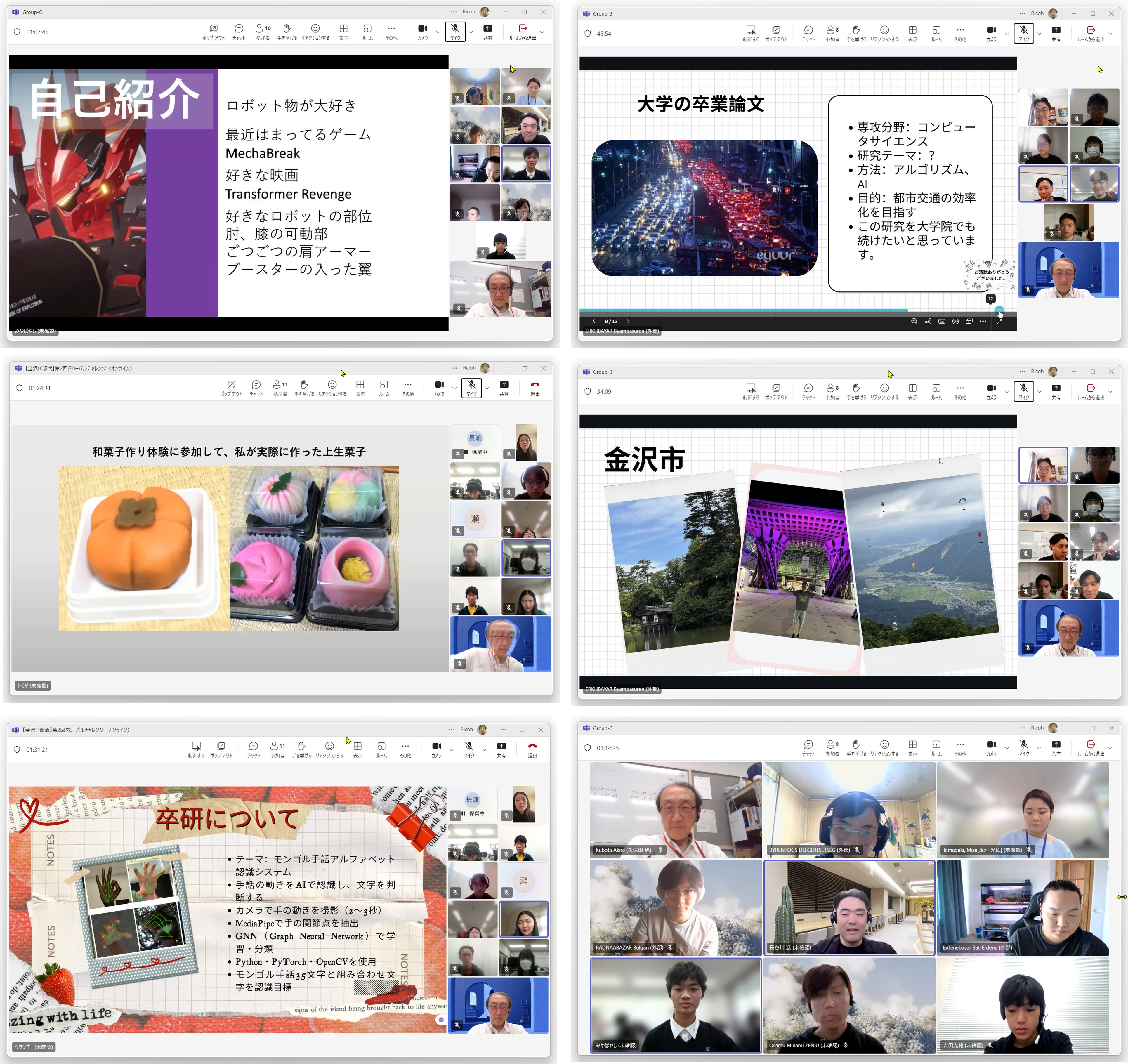 自己紹介から始まり、金沢IT部活で制作している作品や大学での研究内容の共有、