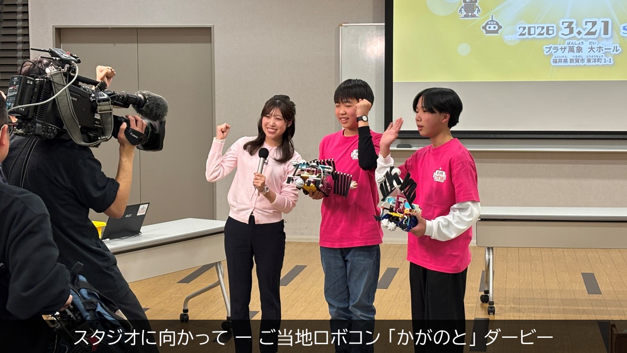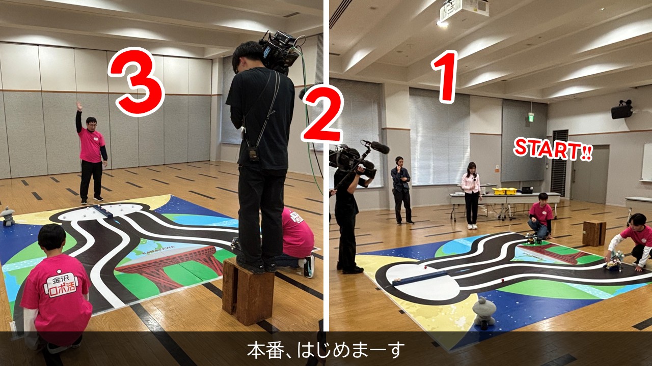 スタジオと中継で繋いで、ご当地ロボコンの説明から、ロボットを動かすのに使っているプログラミングの説明、今回の中継特別ルールでの「かがのと」ダービーの前振りまで順調に進みました。